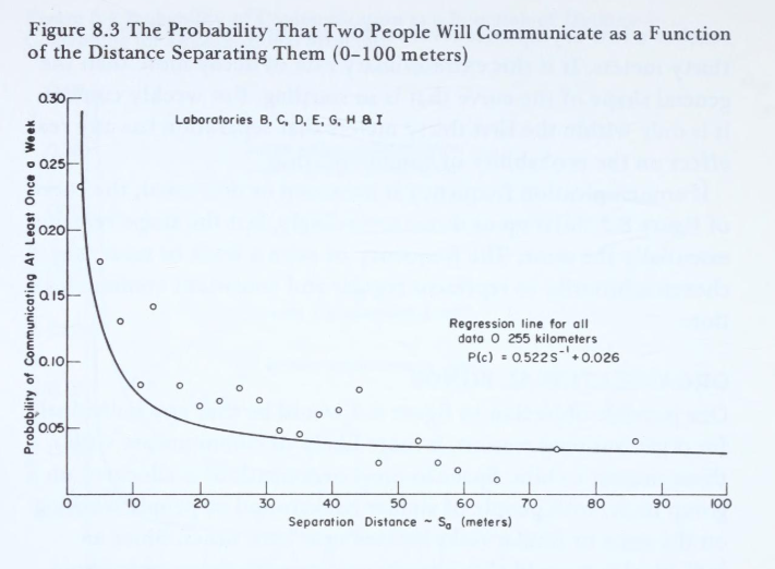 MIT 토마스(Thomas Allen) 앨런 교수의 연구[1]에 따르면, 구성원 간 소통 빈도는 책상 사이 거리와 반비례한다. 책상 사이 거리가 멀어질수록 소통이 줄어드는데, 여기서 주목해야 할 점은 그 감속 폭이 '급격하다'는 것이다. 아래 그래프를 보면, 10미터 이내의 기울기가 유독 가파르다. 5미터 거리와 10미터 거리의 소통 빈도를 비교하면, 불과 몇 걸음 거리임에도 소통 빈도 차이가 두 배 가까이 벌어진다. 참고로 이 연구에서는 이메일을 기준으로 소통 빈도를 조사했다. 따라서 대면 커뮤니케이션까지 고려한다면 그 격차는 훨씬 더 극적일 것이라 짐직할 수 있다.