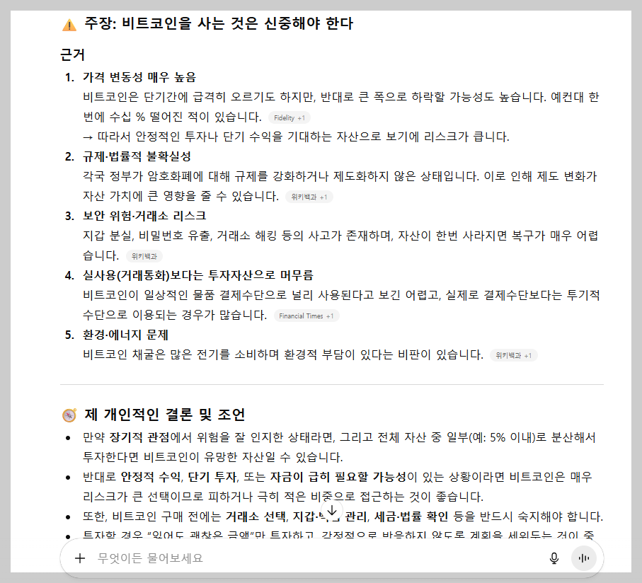 주장과 근거로 구조화해서 글을 읽으면 AI의 주장이 적절한 것인지 아닌지를 판단할 수 있게 된다. 또한, AI의 주장에 논리적인 결함이나 허점이 생각보다 많다는 점도 발견할 수 있다. 이처럼 비판적인 시선을 유지하면 AI를 더 유용하게 사용할 수 있을 것이다. 아래는 주장과 근거로 구조화된 답변의 예이다.