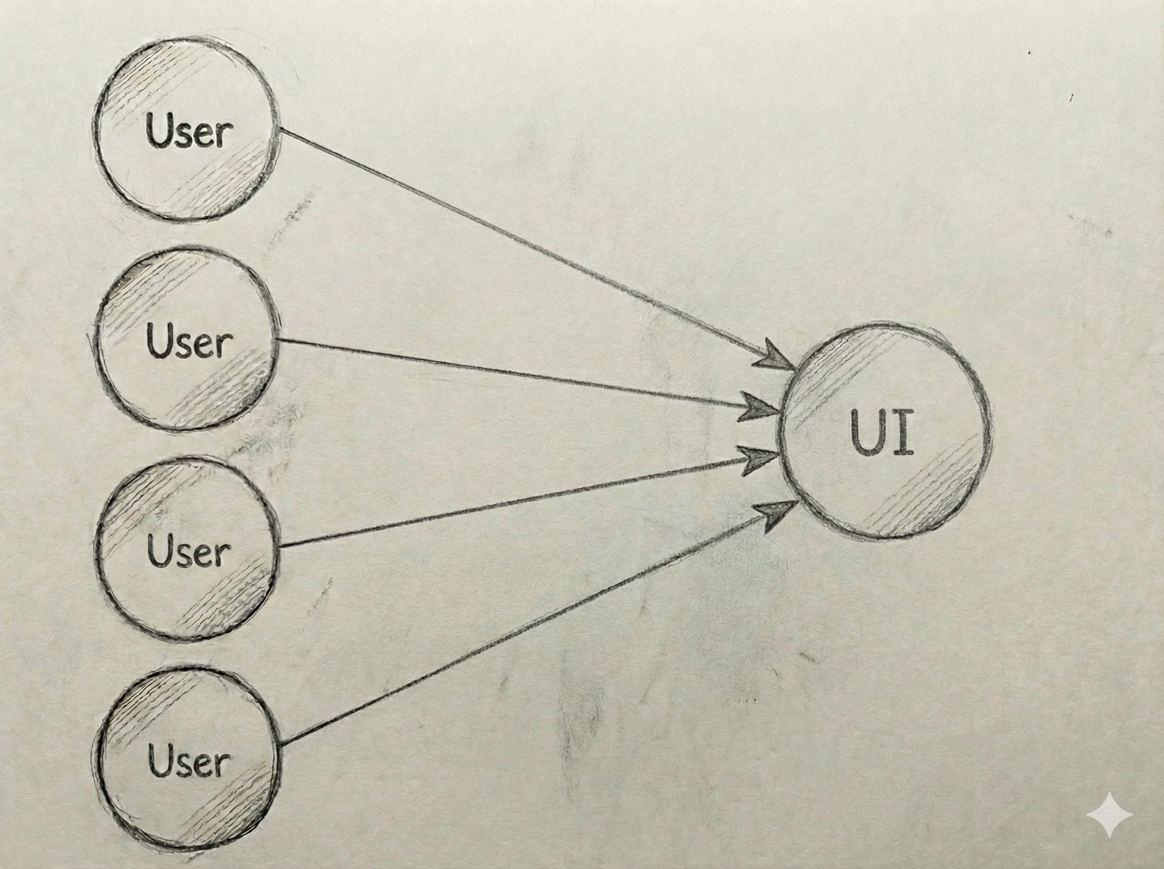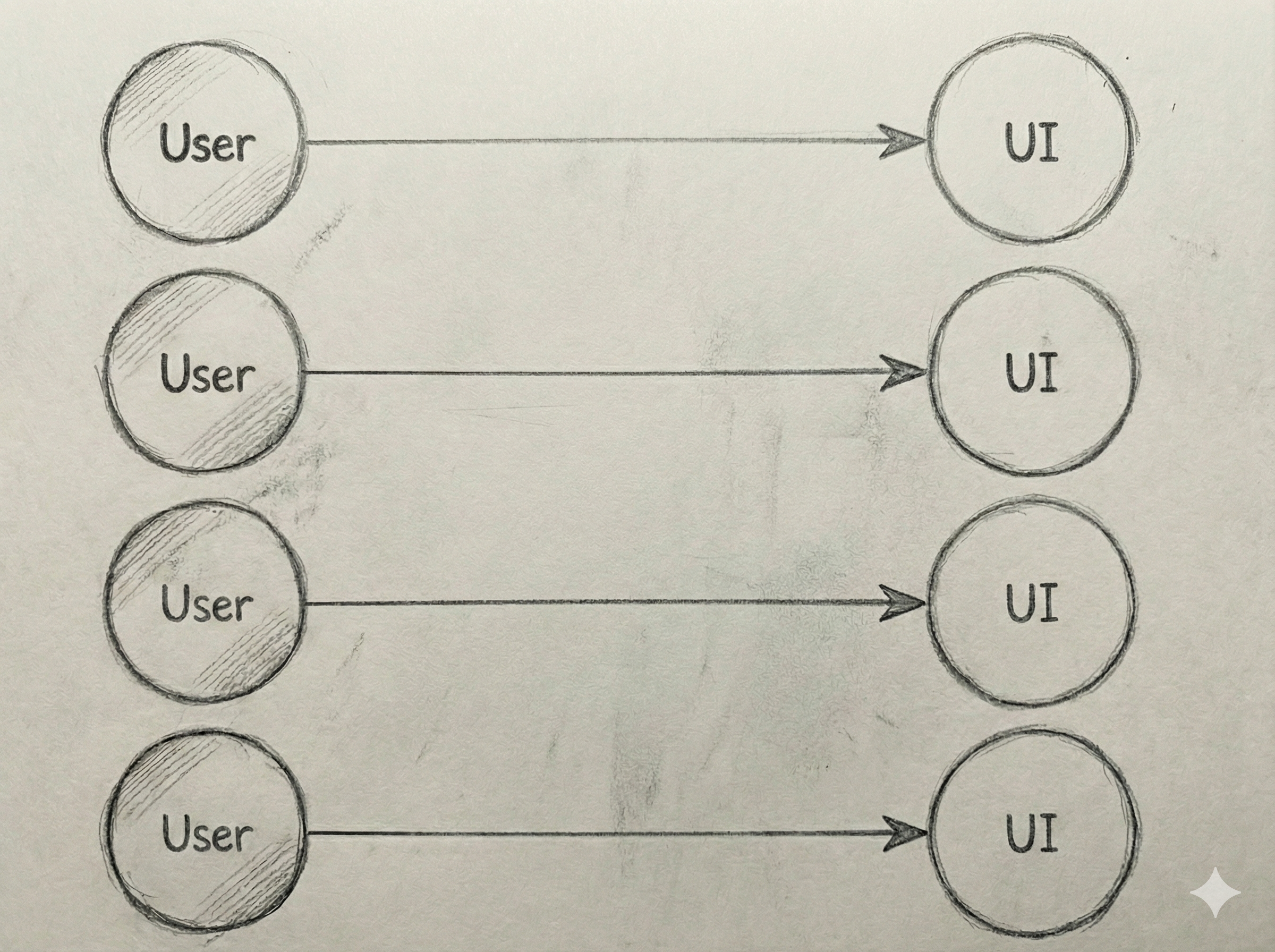 이것이 웹 서비스의 전형적인 모습이다. 물론 A/B테스트가 일반화되고 개인화 니즈가 커지면서 두 가지 이상의 UI를 제공하는 경우도 많아졌다. 하지만 몇 개의 거대한 사용자 집단 단위로만 UI를 다양화하는 수준이다. 개별 사용자마다 다른 UI를 제공하지는 못한다. 화면을 하나씩 더 만들 때마다 제작비와 유지보수 비용이 그에 비례해서 늘어나는 탓이다. 이로 인해, 기업은 하나의 UI만 배포하고 사용자는 하나의 UI만 소비하는 구조가 만들어진다.
