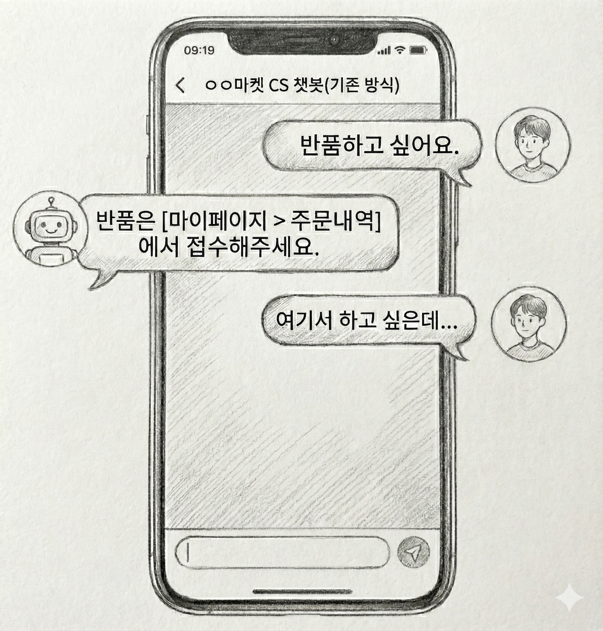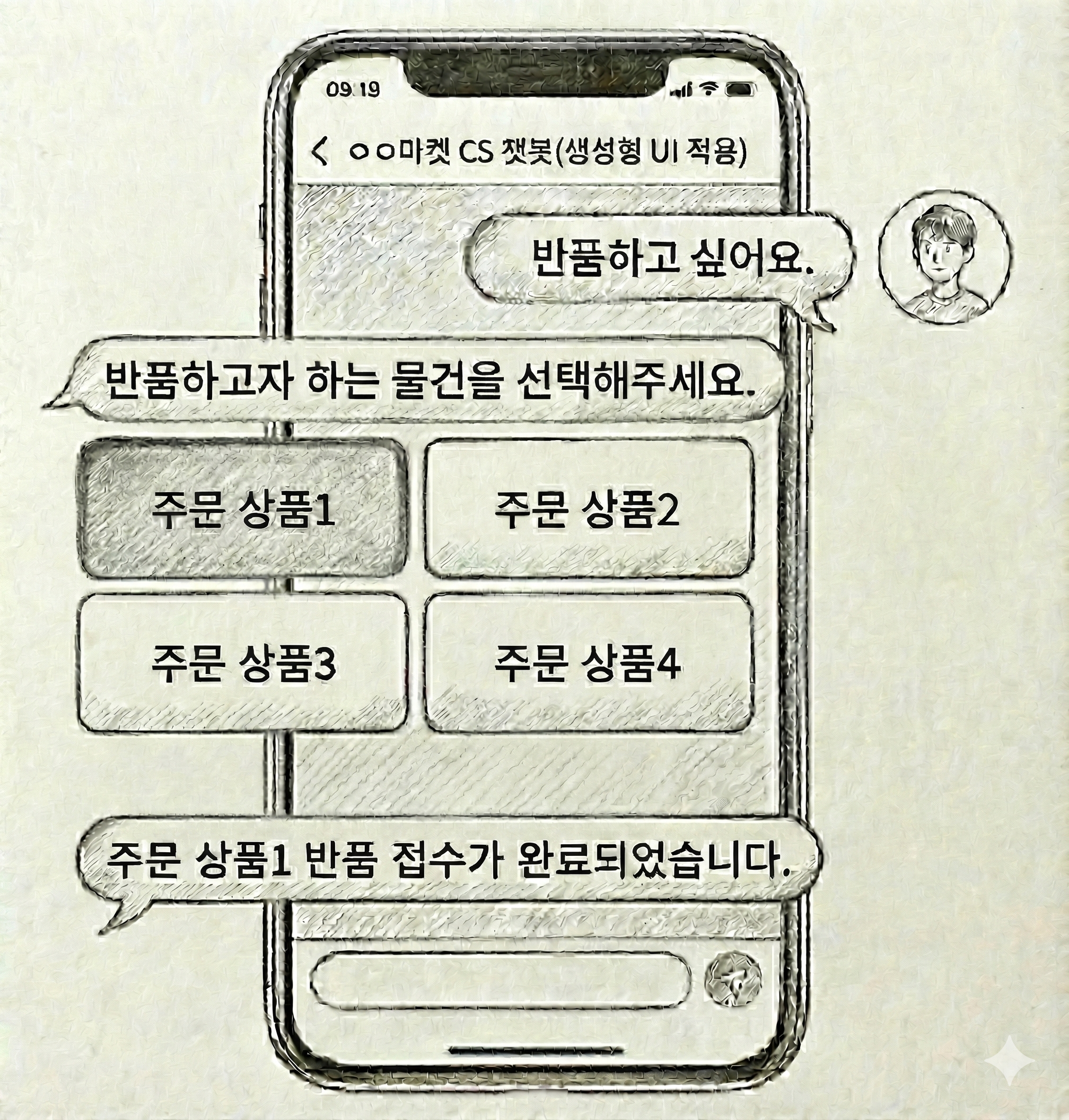 고객 응대용 챗봇은 생성형 UI가 가장 빛을 발할 수 있는 곳이다. 고객 문의는 유형이 너무나 다양하다. 그래서 모든 케이스에 대응하는 UI를 미리 만드는게 사실상 불가능하다. 하지만 생성형 UI는 바로 이런 곳에 적합하다. AI는 고객의 의도를 파악해서 상황에 맞는 화면을 실시간으로 그려줄 수 있다. 덕분에 고객은 텍스트만으로 해결하기 어려웠던 문의를 UI를 통해 쉽고 정확하게 처리할 수 있게 된다. 아래 예시를 보면, 반품 접수 프로세스에서 UI 제공 여부가 사용자 경험에 얼마나 큰 차이를 만드는지 확인할 수 있다.