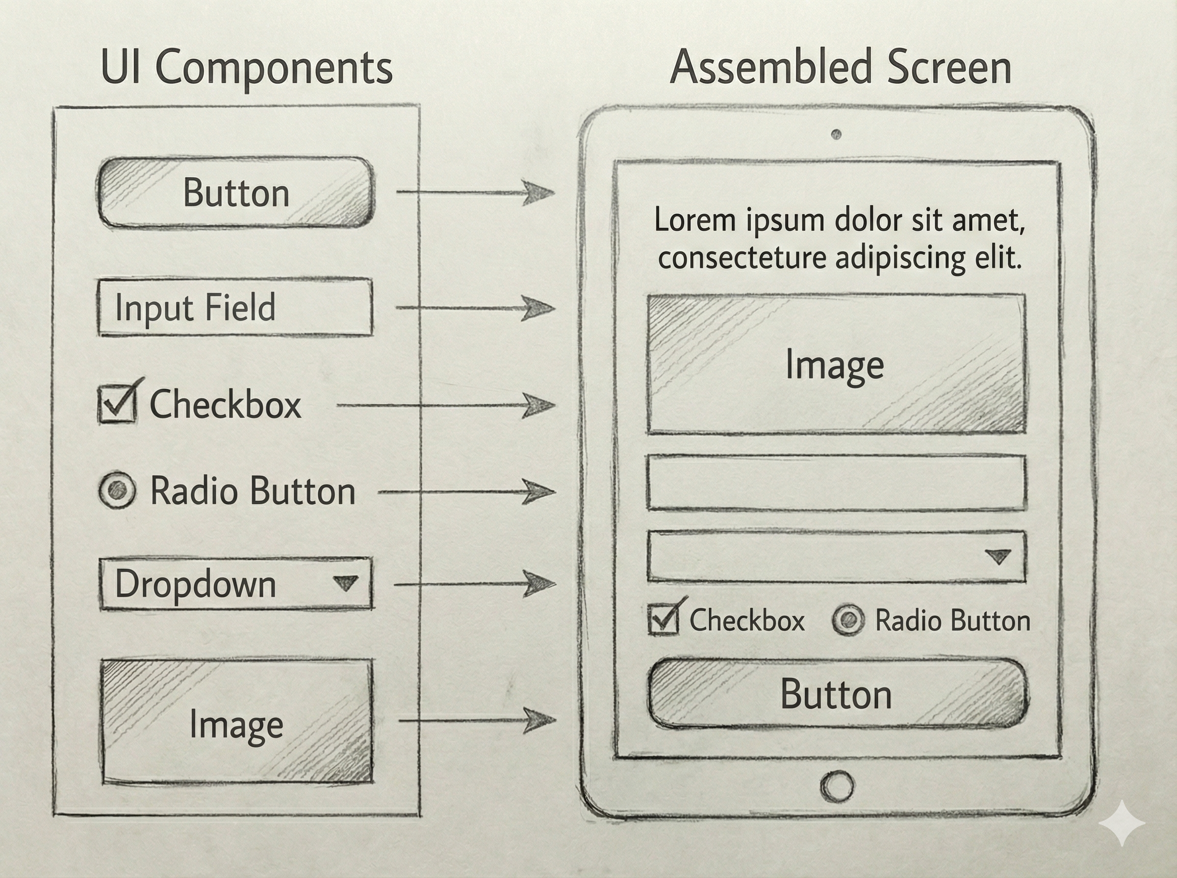 그래서 코드를 전부 다 새로 생성하는 대신, 이미 준비된 컴포넌트를 조합해서 화면을 그리는 방식이 필요하다. 먼저, 텍스트 필드, 드롭다운, 체크 박스, 테이블, 날짜 필터 같은 주요 UI 요소를 미리 만들어둔다. 그리고 유저의 요청이 들어오면 필요한 컴포넌트를 골라서 적절하게 배치를 하는 것이다. 이렇게 하면 다양한 화면을 유연하게 구성할 수 있고 동시에 디자인, 보안, 레이턴시 문제를 해결할 수 있다.